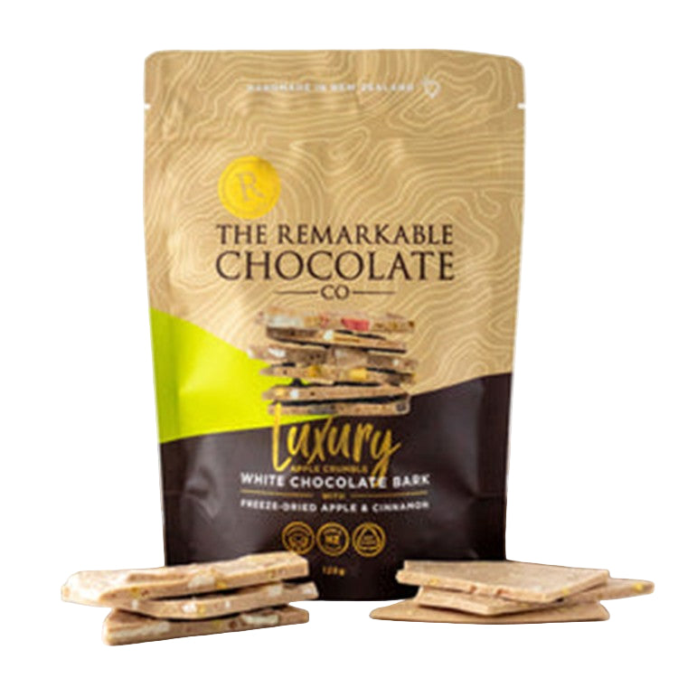 Inspired by the classic homemade apple crumble without the fuss of baking. Chunks of freeze-dried apple, spicy cinnamon, & crumble pieces scattered through creamy 28% white couverture chocolate.