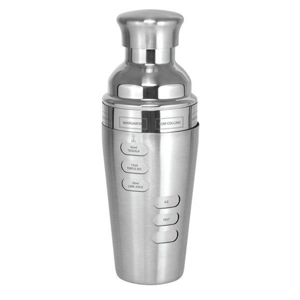 It features a recipe dial insert with eight etched cocktail recipes as well an integrated strainer to separate ice, pulp and fruit from the liquid. Easy-to-use, simply align the arrow on the outer shell beneath the selected cocktail and the ingredients you need will be revealed through the windows to mix your favourite cocktail. Just add the ingredients, shake and serve!
