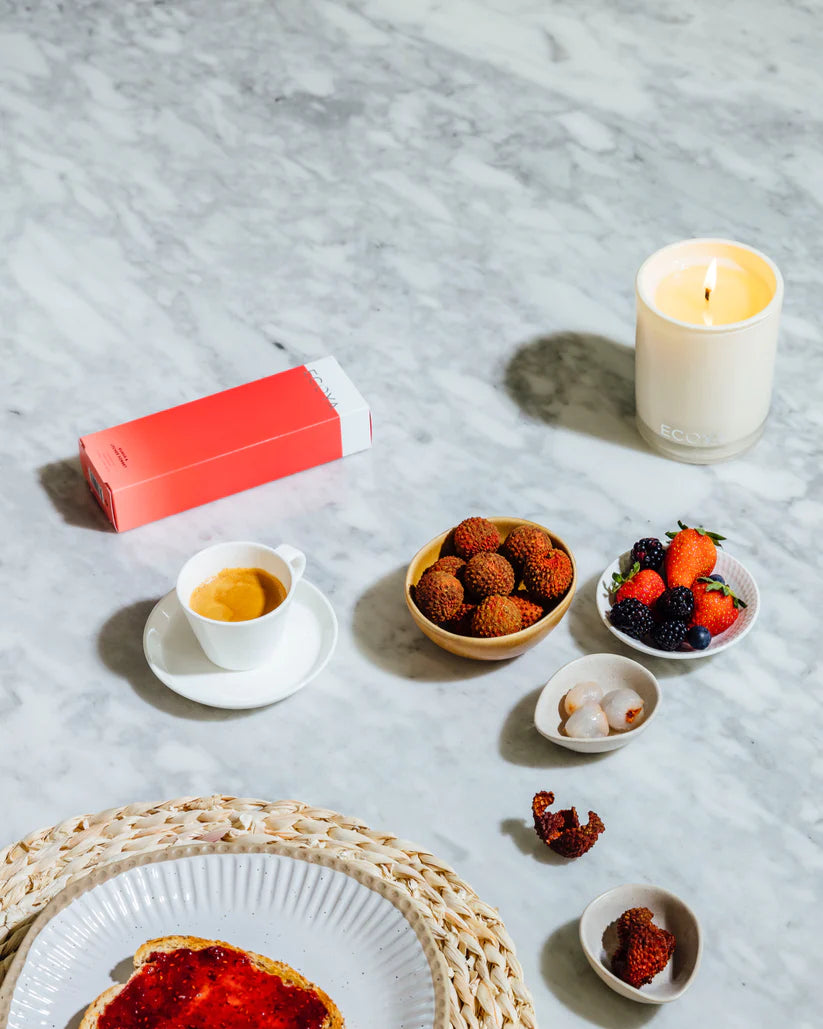A voluptuous fruity fragrance with tropical layers of guava nectar, Queensland lychee and a cocktail of berries
