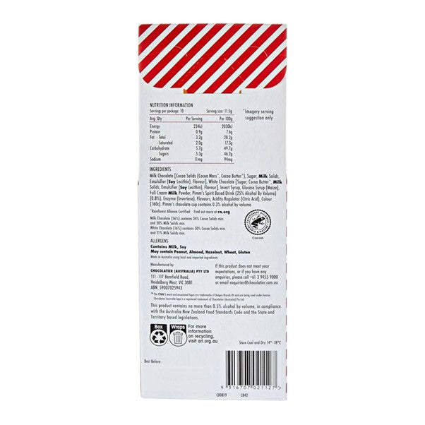 Milk Chocolate Cocoa Solids (Cocoa Mass*, Cocoa Butter*), Sugar, Milk Solids, Emulsifier (Soy Lecithin), Flavour, White Chocolate Sugar, Cocoa Butter*, Milk Solids, Emulsifier (Soy Lecithin), Flavour, Invert Syrup, Glucose Syrup (Maize), Full Cream Milk Powder, Pimm's Spirit Based Drink (25% Alcohol by Volume) (0.8%), Enzyme (Invertase), Flavours, Acidity Regulator (Citric Acid), Colour (160c), *Rainforest Alliance Certified. Find out more at ra.org, Pimm's Chocolate Cup contains 0.3% Alcohol by Volume, Milk Chocolate (56%) contains 34% Cocoa Solids min. and 30% Milk Solids min., White Chocolate (16%) contains 30% Cocoa Solids min. and 21% Milk Solids min.