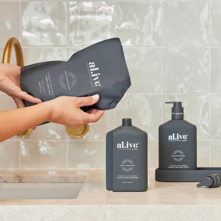 The al.ive body Coconut & Wild Orange Hand & Body Wash Refill contains a luxurious blend of naturally derived ingredients, fortified with essential oils and native botanical extracts.